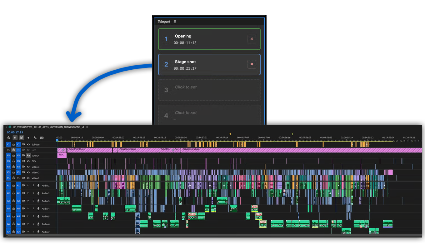 If you've ever worked with a director who wants to quickly grab a shot from scene two and move it to scene twelve, then you know what to do. You have to zoom out, scroll across a lot of clips to find the shot, move it, and then...where was I again? The Teleport plugin for Premiere Pro solves this issue.